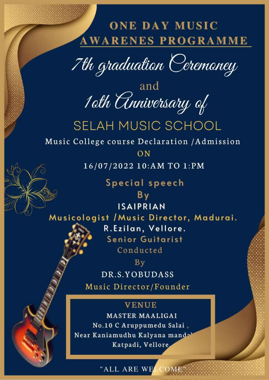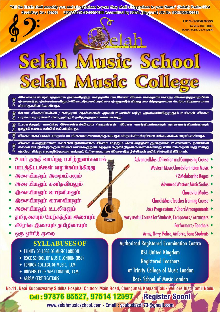 2nd Graduation day held on 09 Mar 2014 the students of selah music school have got London trinity college certificates grade 1 to 3,students have got distinction and merit , highest marks scored 98 per 100 by trinity college of music in London through selah music school certificates were issued by Chief Guest Dr. Y. David Dhayanandan Music Director, in the presence of Mr.K.C.Venkatesan music master and Rev. JohnVimal, all the students were prepared by S.Yobudass Director of Selah Music Schoolwhich is located in Vellore.DT